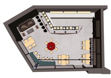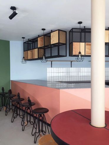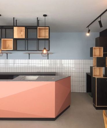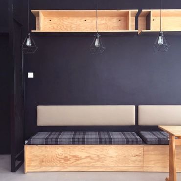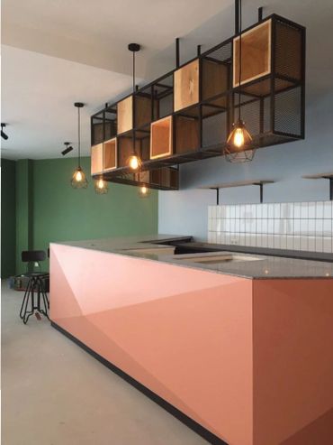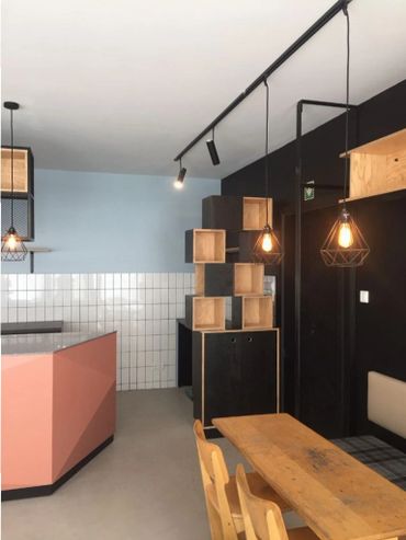 This café serves as the best coffee place in the small town of Werl and is combined with a yoga school on the upper floor. The design was inspired by the name „Malschule“ which in English translates to drawing school. The use of school elements such as the vintage school desks and chairs accentuate the look. Furthermore, materials like linoleum, blackboard and plaid-pattern upholstery are in keeping with the concept.