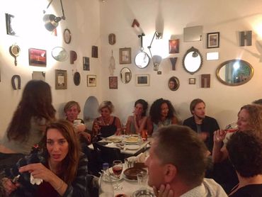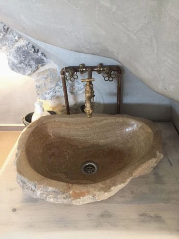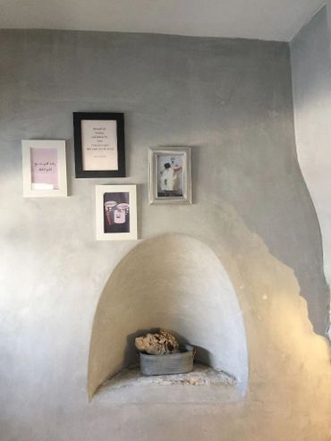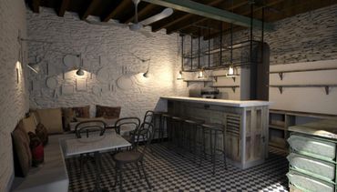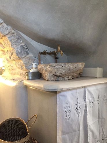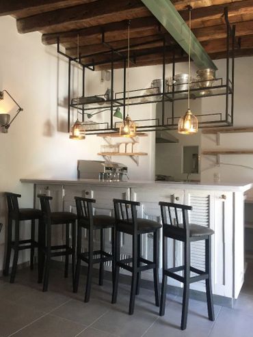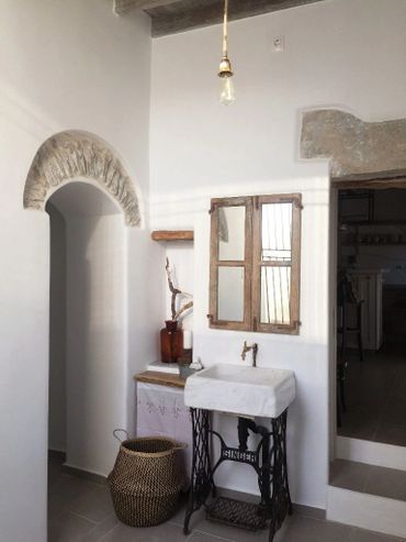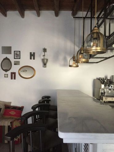 The interior is styled with objects found in Berlin flea markets such as lighting fixtures, mirrors and picture frames. The bar panels are comprised of re-cycled doors and shutter windows, found in the local junkyard on the island. The marble basin on the sewing machine base is also a local found object.