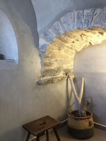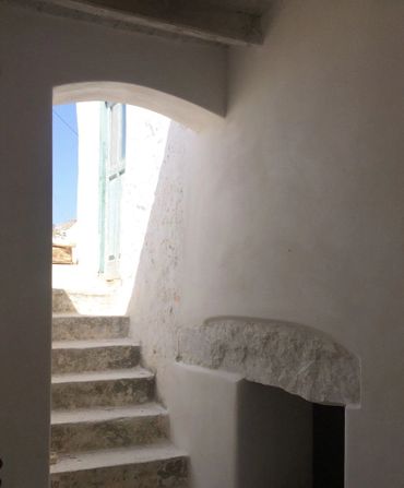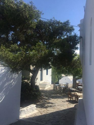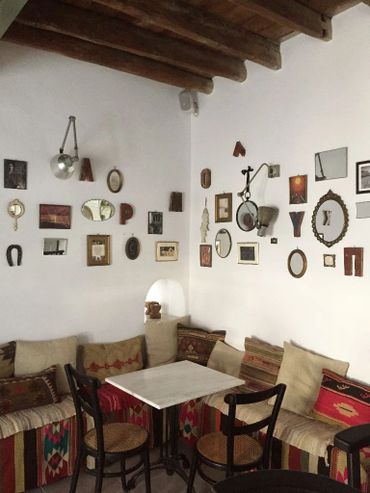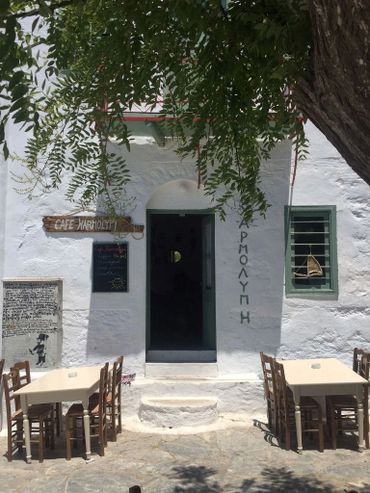 On a picturesque square on the Greek island of Amorgos, the cafe occupies the ground floor of a traditional villa.